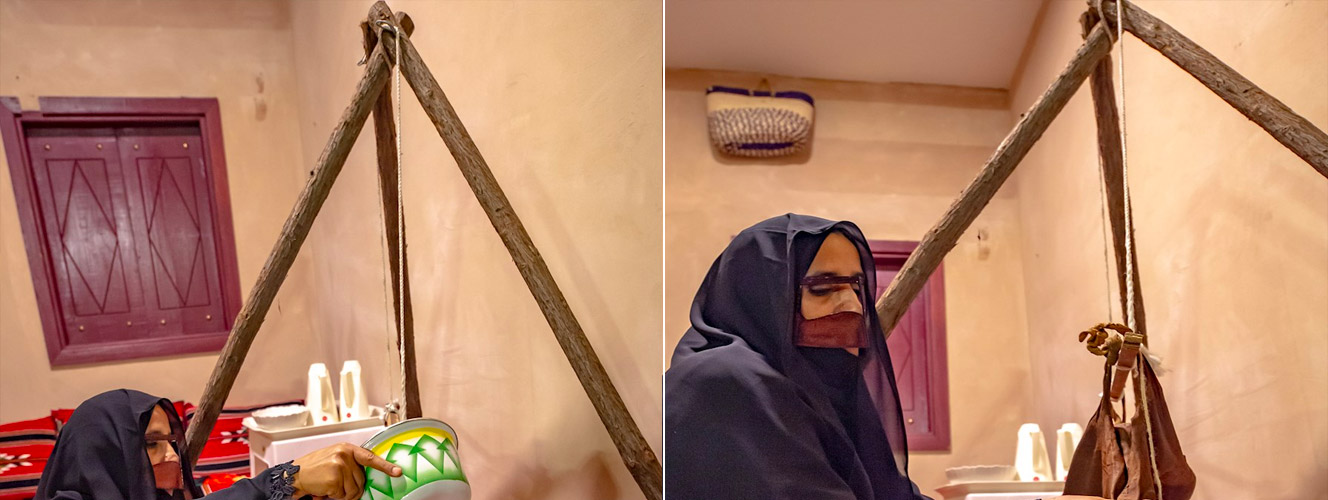 تحلب البقرة في اليوم والليلة خمس مرات بعد ذلك تجمع في اناء لين تصبح روب ، اذا ما رابت بمعني " خمرت " يابو لها لبن يسمونه " حروس " يضيفونه على الروب صبوه في السقا خضوه لين ماتسمع الحرمة اللي تخض صوت الخض تغير مثل رمي الحجارة على جسم معين من بعيد وقفت عن الخض واظهرت الدهانه التي هي الزبدة وتضع اللبن في ماعون وجمعوها من اجل ذوابتها وعمل الدهن الذي يعرف بالسمن . حيث تجلس المرآة القرقصاء بمحاذاته لإمساكه من الحبل والقيام بعملية خض اللبن داخل " السقا " الذي يختلف في الحجم ، بين كبير ووسط وصغير .