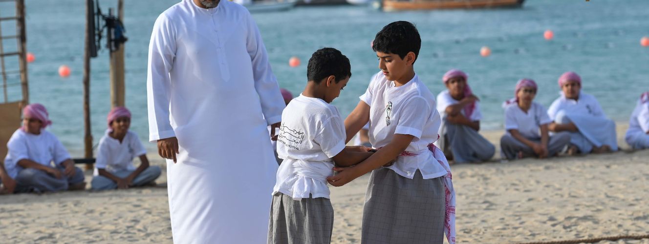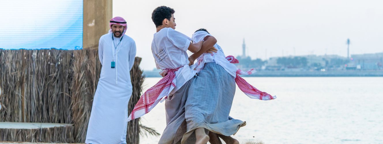 Wrestling has been a popular folk game among Arabs since ancient times. It would be played by boys in the past in open areas (baraha) without any specific rules or instructions. The game doesn’t require more than a sandy space that doesn’t cause harm to the players and that can accommodate spectators. The wrestling ring is a circle drawn on the floor by a boy chosen by the group as a referee. How wrestling is played: In an atmosphere of action and excitement, two players enter the circle and lock hands, each trying to throw the other to the ground. The players usually stand with their feet apart so as not to lose their balance.