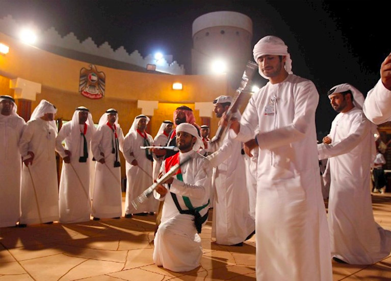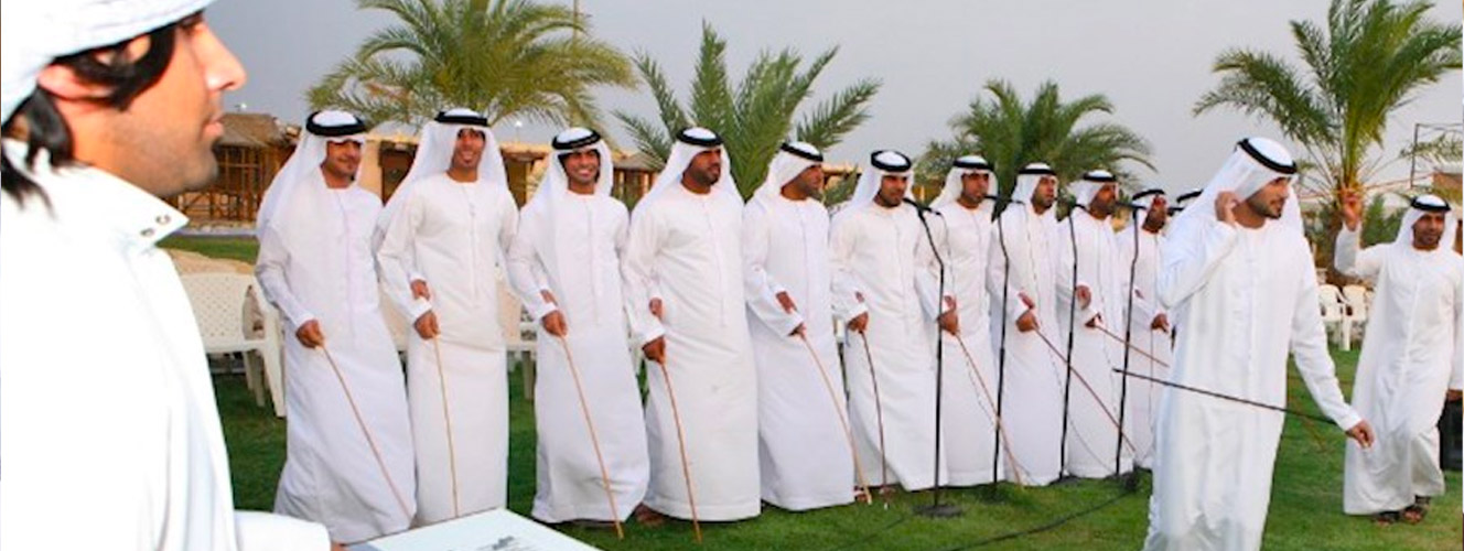 Al-Razfa is a traditional performance comprising dance and poetry that is deeply rooted in United Arab Emirates culture and an important addition to intangible cultural heritage. Performed at weddings, national holidays and other special events, it is a popular Emirati performance that combines poetry with a dance that uses thin bamboo canes. In the past, swords or daggers were used instead of canes. This delightful art gives performers a sense of identity and communication through their songs and rhythms that have been maintained in Emirati culture for many years